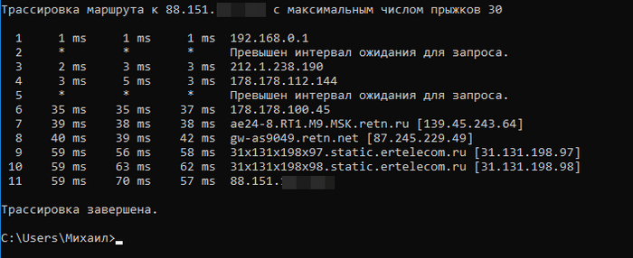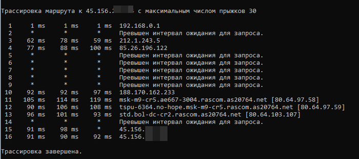 Вывод: Низкие задержки до Google (13.6 мс) и Яндекса (24.5 мс). Traceroute показывает маршрутизацию через российские узлы.