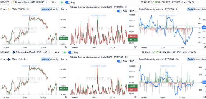 В ходе анализа бид/аск в стакане ордеров на рынке BTC не наблюдается явного дисбаланса в пользу ни лимитных покупателей, ни лимитных продавцов. Отсутствие перевеса в одну из сторон указывает на то, что в текущий момент рынок находится в руках рыночных игроков. Это свидетельствует о том, что основные движения курса BTC происходят под влиянием рыночных ордеров, а не из-за давления одной из сторон лимитных участников.