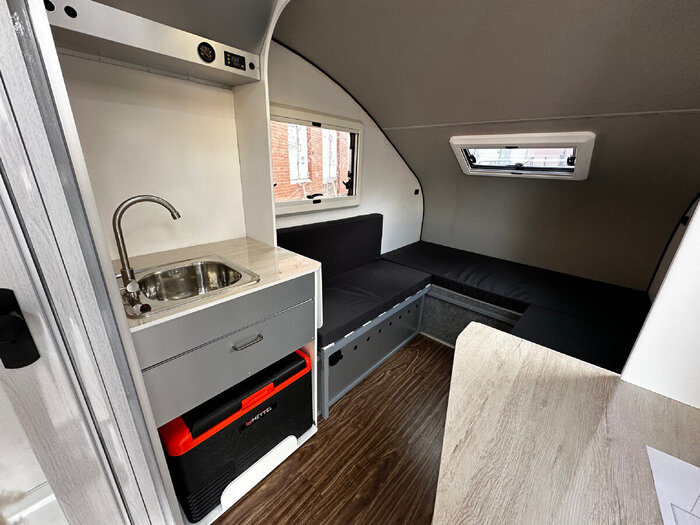 В последующих модификациях возможна установка газовой плиты. Но поскольку есть запрос на приготовление пищи снаружи прицепа, то предлагается использовать внутри или снаружи переносную туристическую плитку, а не встраивать стационарную.