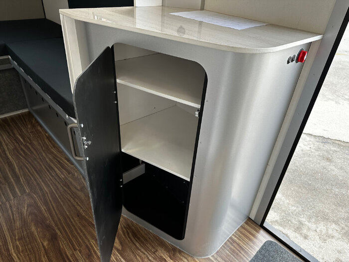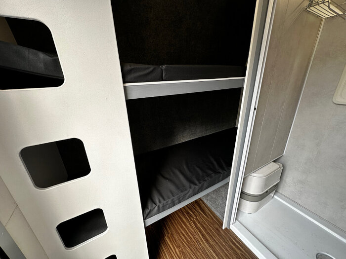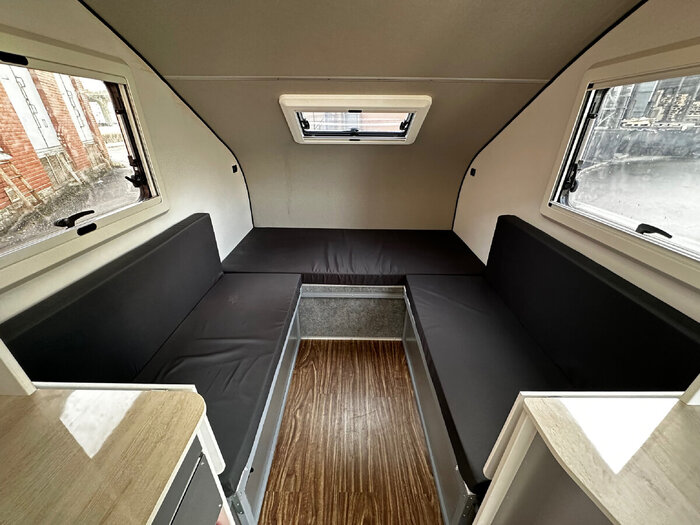 Караван имеет классическую планировку с П-образной гостиной впереди, детскими кроватями в два яруса сзади и хозяйственной зоной посередине. Она включает в себя кухню и санузел.