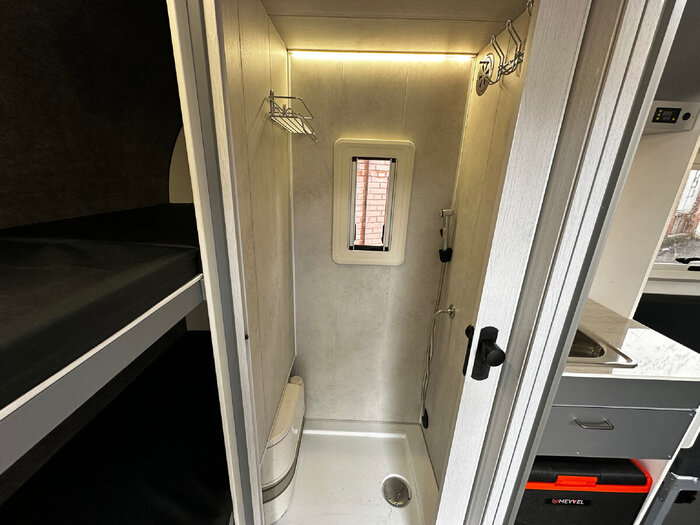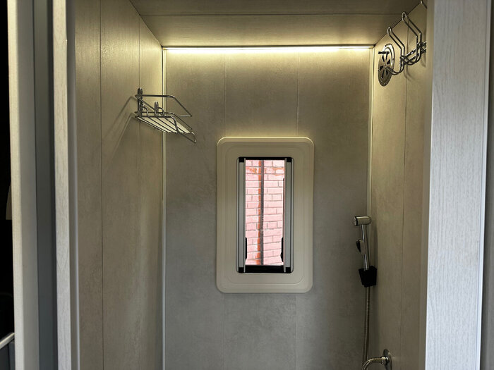 Туалетная комната имеет комфортные размеры и важной деталью здесь будет ниша, в которую убирается переносной биотуалет. Такое решение еще не встречалось в российских караванах.