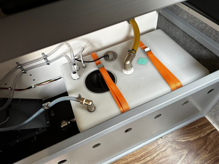 Запас воды объемом 50 литров располагается под диваном в гостиной. Насос подает воду в кухонную мойку и душевую кабину через проточный газовый водонагреватель.