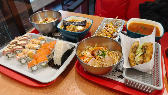 Теперь, с примерным представлением того, как обстоят дела внутри заведения, можно переходить к еде. Я думал оценить и описать каждое блюдо в отдельности, подобно булочкам в прошлом посте, но все блюда объективно сделаны с упором на дешевизну, оттого и качество, что вкус оставляют желать лучшего. Поэтому не сильно заостряя внимание, дам лишь краткую оценку того, что по моему мнению стоит подметить.