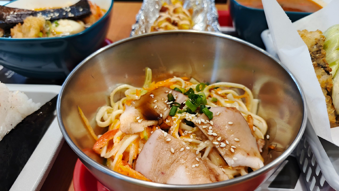 · Вок с копченым цыпленком и овощами. Как правильно выразился мой товарищ - макарошки с мазиком. Оно то норм, но с воком ничего общего это не имеет, от слова совсем. Можно взять как небольшой перекус, но точно не азиатское блюдо, которым его пытаются выставить.
