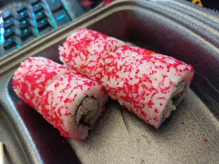 И вот начинаю есть… Всё горячее!!! Это что, стёб? Почему я обычные (не печёные) суши должен есть горячими из-за того, что мне доставляли их верхом на пицце? Я был в шоке, просто хотелось выкинуть!!! Но я не привык разбрасываться едой и поэтому решил есть. Пробую… Первые несколько секунд я не мог понять… Это что… Десертные с каким-нибудь бананом? Нет, просто рис был буквально приторно сладким. От неожиданности выплюнул… Жрать это было невозможно… Ну с соевым то соевым лучше будет, подумал я, он нивелирует своей солёностью сладость риса. Фиг там! Соус был ещё более разбавленным чем был раньше! Я его хлебнул и не почувствовал его вкус во рту, даже отдалённо КАКОЙ УЖАС!!! Благо у меня есть потрясающий соус и с его помощью получилось забить вкус этой гадости.