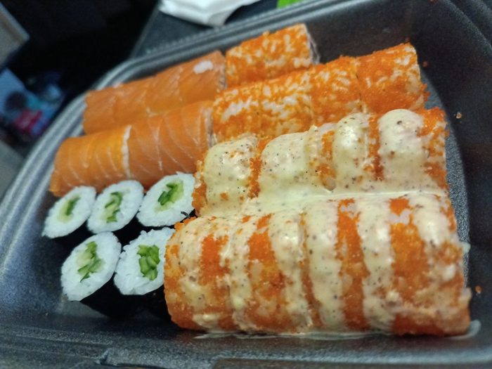 Впервые лет за 25 я выкинул готовую еду!!! Хотя горячие, сладкие роллы с огурцами я съел, а вот остальное в мусорку.