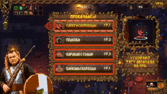 Лишь у костра вы можете повысить уровень и выбрать себе перк. Как по мне, не все перки одинаково полезны. Кажущийся самым бесполезным — перк на увеличение... количества перков в окне выбора. Или перк на дружелюбность оленей: при нужном навыке их вполне можно догнать. Лично я удалял внимание опыту, урону и количеству материалов. Невероятно важен и перк, который позволяет есть грибы, ягоды и яйца, чтобы пополнить здоровье. Во время исследований незнакомых мест это очень помогает.