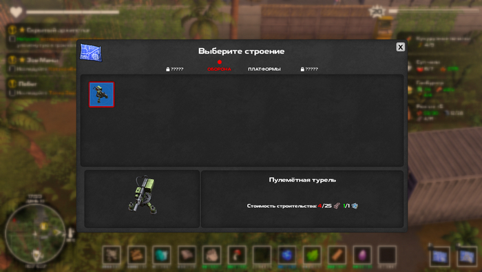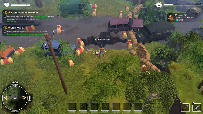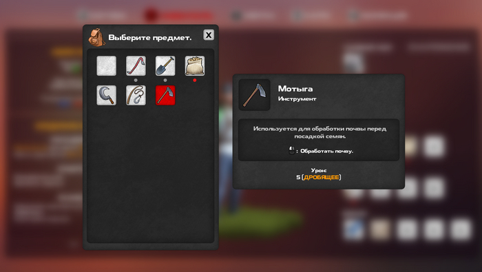 Клавиша 1 отвечает за переключение спецпредметов — оружия/инструмента для демонтажа. 2 — специальные предметы, например, метательные ножи или бинты. В самом начале мы бомж, который мало чего может. Позже сможем сделать себе лопату для раскопок, мотыгу для обработки земли, пакет с семенами, удочку, серп, мачете и т.д.