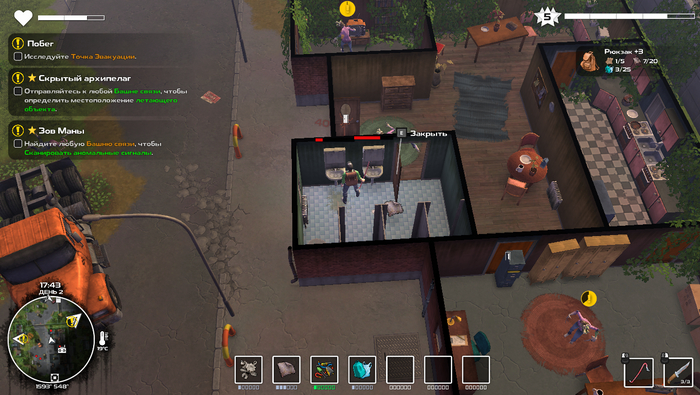 Далеко не всем понравится, что непрокачанный ломик не сможет разбить некоторые предметы. Но игра вежливо покажет вам, какой урон нужен, чтобы сломать ту или иную вещь. Что логично, ломик вполне хорошо ломает керамику, те же унитазы. А вот резину нужно добывать колюще-режущим. Вообще, разрушать всё весело. Со временем почти всё можно будет переработать, даже деревья. Круто, что если на столе стоят тарелки или кружки, то герой сначала разбивает их.