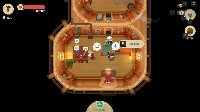 Итак, днём управляем магазином. Вроде бы ничего сложного: раскладываешь товар — стоишь за стойкой и ждёшь, потом пробиваешь покупку. Если нечего продавать — закрываешь магазин. А при свете луны направляешься к входу в подземелья, комнаты которых сгенерировал искусственный интеллект. Всё. Особой глубины у ухо-горло-носа или сюжета нет, но игра затягивает. И порой сложно объяснить, чем.