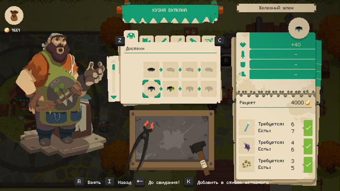 Невероятно важны кузнец и зельеварщица. Лучше подготовитесь к ночной вылазке — больше принесёте. Если при покупке зелий есть опция их заказа без нужных ингредиентов в инвентаре (дороже, конечно), то предметы кузнеца требуют заготовок. Приносишь — куёт.