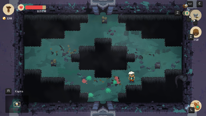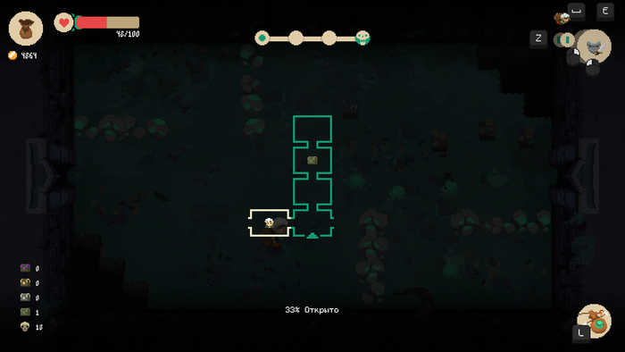 Главный соблазн для игрока возникает в преддверии новой комнаты. Зачистил комнату — открыл сундук — разместил предметы и начинаешь размышлять.... Если очков жизни мало и не осталось зелий, то выгоднее воспользоваться возвращением в город (у меня на скринах на клавишу L). А то залетишь в новую комнату, помрёшь и потеряешь львиную долю "награбленного". Ну и надеяться на амулет возвращения в пылу схватки не стоит: атаки врагов могут сбить процесс (телепортация к дому не моментальная). После "гибели" игра предлагает переиграть забег с нуля или же вернуться наружу. Во втором случае тебя выкидывает рядом с входом подземелья. И ты идёшь к магазину-дому пешком.