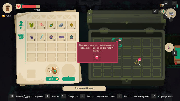 Кстати, попутно расскажу о первой сложности игры, которую надо преодолеть. Не сказать, что интерфейс перегружен, но к нему надо привыкнуть. Игра позволяет брать как один предмет из ящиков в подземельях или при переносе из сумки на прилавок, так и стопку. Просто внимательно посмотрите на иконки и не торопитесь.