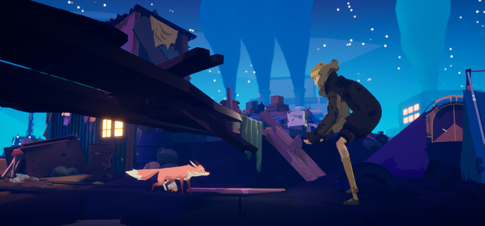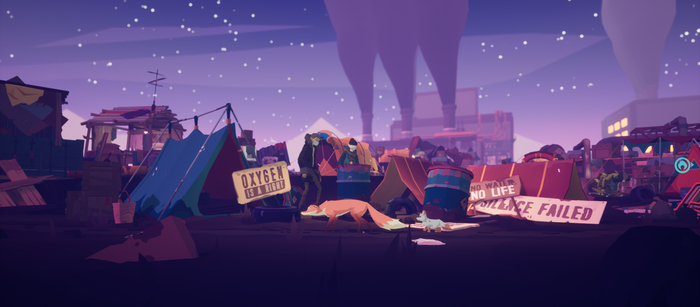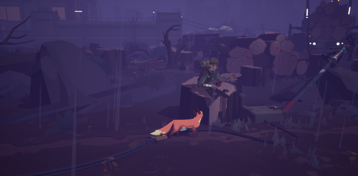 В целом картинка постапокалиптического пейзажа очень приятная и проработанная в минималистичном мультяшном стиле, что относится как к окружению, так и к персонажам вроде лесников в противогазах. Это очень приятно глазу, особенно я отмечу работу с цветовой палитрой и освещением. Но у этого есть и недостатки, ведь минималистичный стиль не даёт возможности изобразить на мордочках весь спектр эмоций, и временами кажется, что могло быть лучше, особенно в сценах крупным планом