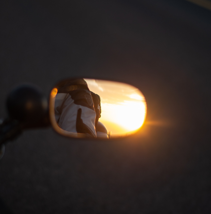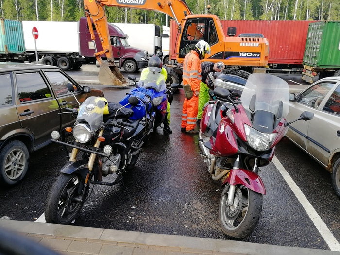 А вот - небезызвестная точка неподалёку от аэропорта Шереметьево, ну и закат. Туда нас занесло после Джимханы Л73, благо близко. И вроде ничего не мешает сделать то же самое на машине, да? Не совсем. Проехать последние метров 300 на легковушке будет сложновато - слишком плохая дорога. А у мотоцикла только одна колея и куда меньше расстояние между колёс. В итоге - можно обрулить ямы и проехать там где на обычной машине ехать уже не хочется. Да и спрошу честно - готов ли ты, водитель автомобиля и житель Москвы, вечером ещё куда-то тащиться? Наверно ты сегодня ездил на работу и с работы на машине по 1,5-2 часа в дороге - и не хочешь больше? А я ездил на метро - и хочу) А даже если и не на метро - всё равно хочу. Вот нравится мне на мотоцикле ездить по незнакомым местам, просто нравится.