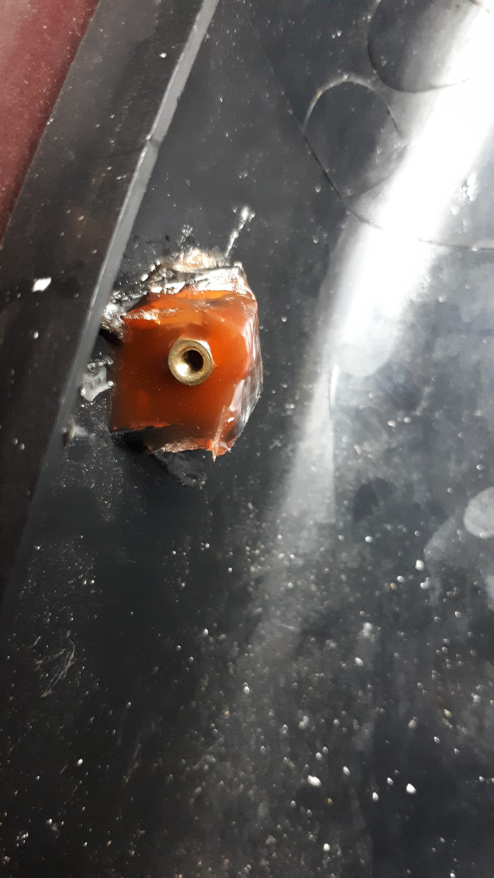 Перед вами крепеж верёвочек что не дают кофру открыться дальше нужного. Конечно, это уже не заводское решение, это её величество эпоксидка. Заводское решение это тонкий цилиндрик с тонюсеньками рёбрами жёсткости в который вкручивается саморез! Два таких крепления держат верёвочки, но, поскольку верёвочки не пружинят, газлифтов нет а петли свободные (читай: раздроченные с завода) то крышка падает с большой скоростью и дёргает эти крепления, выламывая их. Но если бы только это! Идентичным образом устроено и крепление ушек замка, что держат крышку закрытой. Да, вы не ослышались, 4 самореза на крышку. А знаете, что ещё? Лишь один! один!! умерший саморез утянет всю крышку в валгаллу. Потому что сперва из-за другого угла нагрузки сломается посадочное второго, а потом одна петля не удержит крышку на кочках.