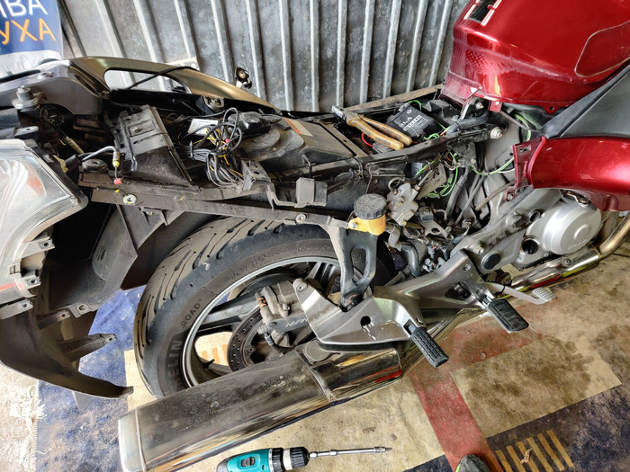 Возвращаясь к упоротости Хонды, боковые обтекатели красного цвета это единая деталь. Кстати, правую, к примеру, нужно снимать чтобы поменять охлаждайку. То есть вы просто хотите поменять ОЖ и вам нужно всего-то снять: