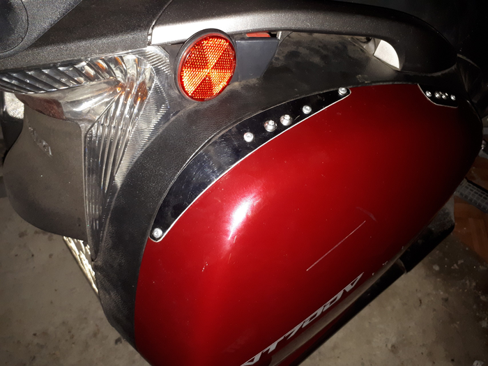 Плохо с пластиком. Строго говоря, с пластиком плохо решительно всё. Не знаю уж что там у хонды были за проблемы перед выпуском девилей, но мотоцикл спроектирован совершенно бездарно. Весь чёрный пластик что вы видите на предыдущем фото за исключением обрамления кофров - гибкий, чёрного цвета, покрашен серым грунтом и чёрной краской под кожу. При этом встает он на свои места с помощью выгибания. Это приводит к следующим проблемам.