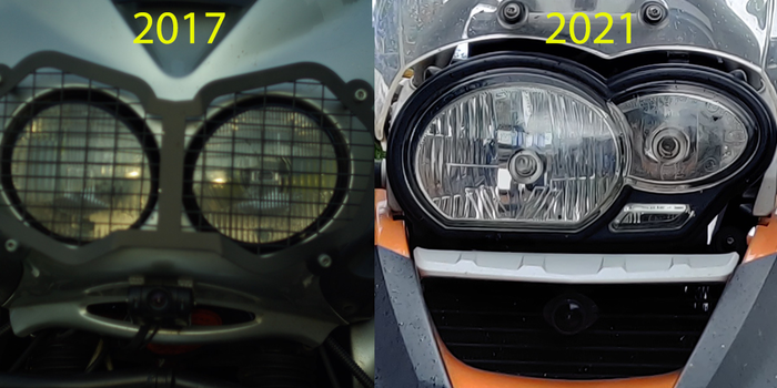 На трассе проблем ожидаемо нет. Запаса мотора достаточно всегда, можно с комфортом ехать свои 130 и, не смотря на низкое стекло, всё ещё слышать музыку с неплохим запасом громкости. Боковой ветер и потоки от фур этот локомотив трогают слабо. В дождь на ходу мочит только ботинки. При этом под действительно дальнюю поездку я бы всё же заменил стекло на высокое, благо поставить его можно от Gold Wing и без переделок. Свет я ожидал более эффективный, популярный тюнинг это установка bi-LED модулей в сборе, можно даже пройти одобрение изменений в конструкцию, люди проходили. Найти работающие нижние противотуманки – проблема. Они либо очень дорогие, либо не очень и не светят. Такая же проблема с греющими ручками, грипсы длиннее обычного и весь алиэкспресс не подходит, а родные ручки стоят порядка 200$ что непозволительно дорого за их функционал.