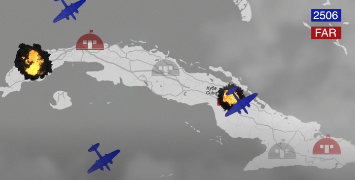 Для того, чтобы скрыть участие Соединенных Штатов, придумали классную схемку. Они взяли точно такие же самолеты, как у Кастро, потому что он их закупал свое время Великобритании, покрасили их те же самые цвета и обучали кубинских пилотов пилотировать эти самолеты. Ну это просто часть ВВС Кастеро, они улетели и они теперь за нас. Это не американский ВВС соответственно.