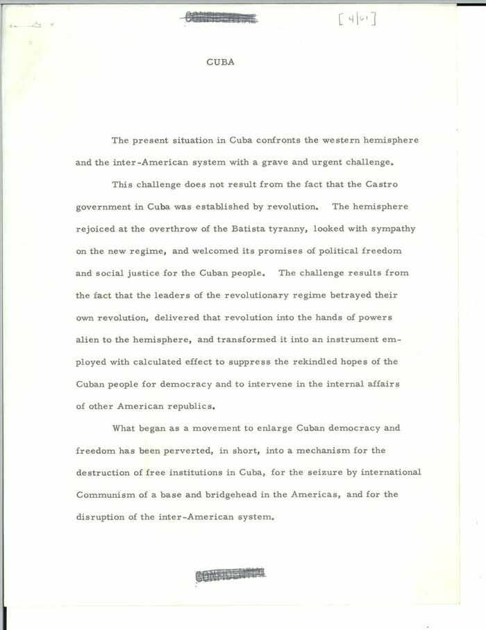 Там был и такой фрагмент: Доктор Миро Кардона решительно опроверг сообщение о том, что его группа поддерживается центральным разведывательным управлением США. Он сказал, что она была создана исключительно кубинцами и не только теми кто находился в изгнании, но и бойцами на Кубе. Он подчеркнул, что организация была создана вмешательство какой-либо организации за пределами Кубы. На вопрос о том, общался ли он когда-либо с ЦРУ, он сказал определенно нет. У меня никогда не было никаких связей с этой или любой другой внешней организацией.