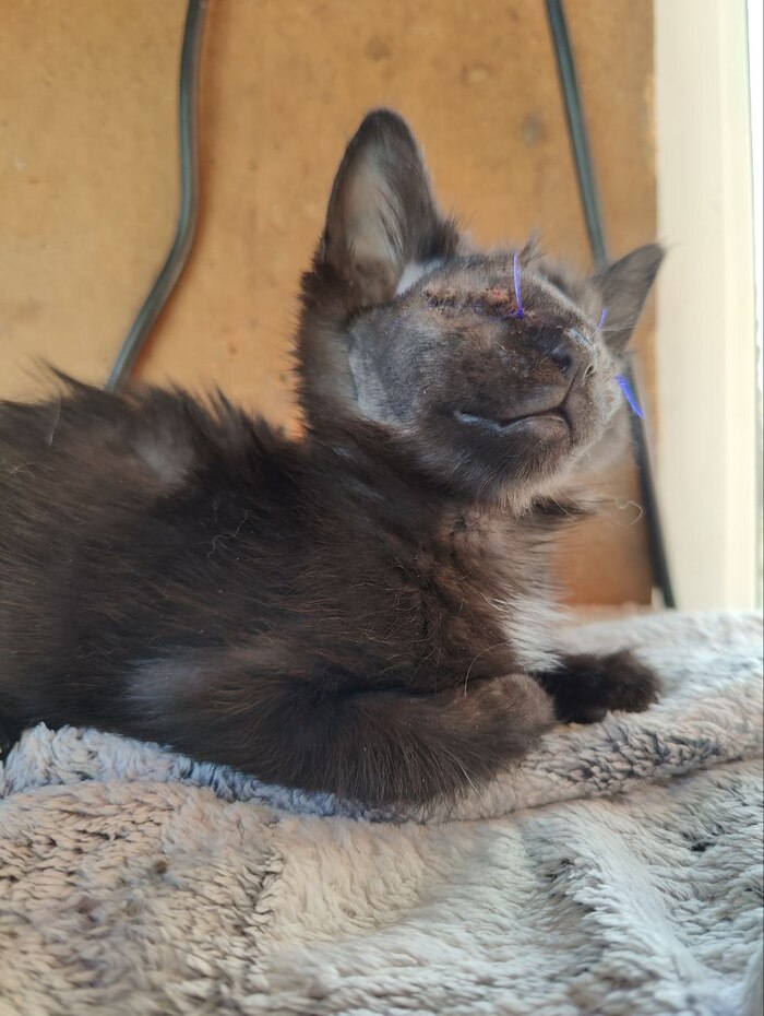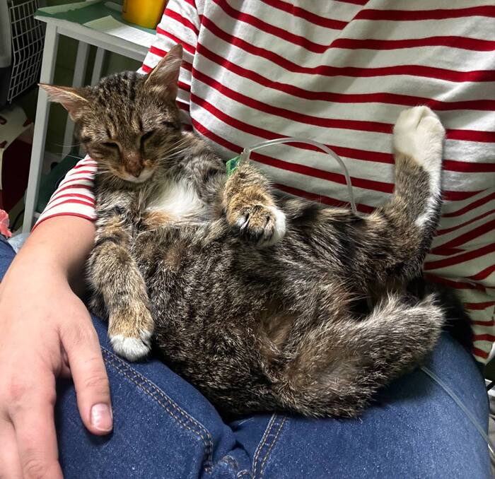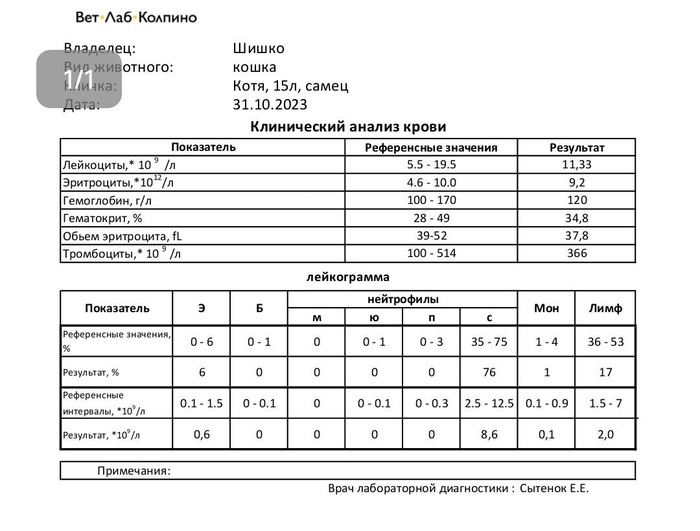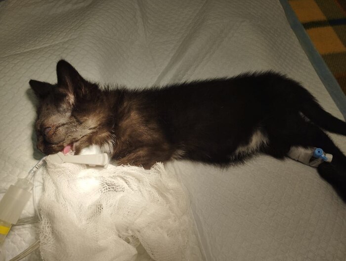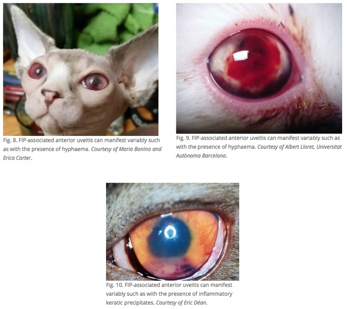 Но совсем недавно у котенка стала держаться высокая температура и помутнел глаз. Плюс несколько дней назад вылез выпот. К сожалению, местные врачи утверждают, что это не ФИП на основе одного анализа, хотя все анализы (в том числе соотношения показателей крови) говорят о том, что у котенка ФИП. У Ларисы же куча животных, есть инвалиды и денег на ИФА или на анализ выпота нет.