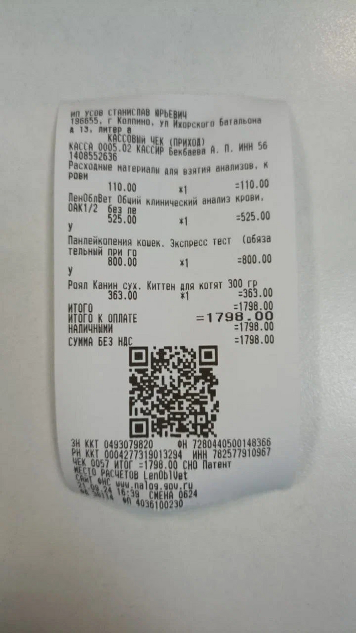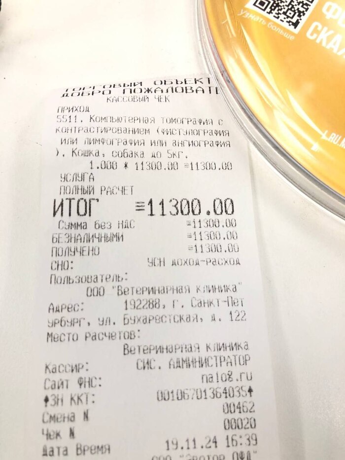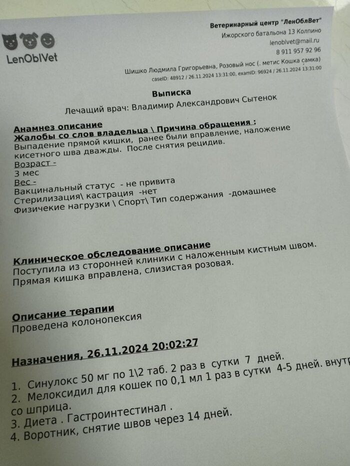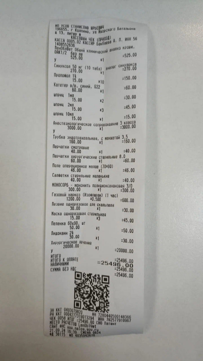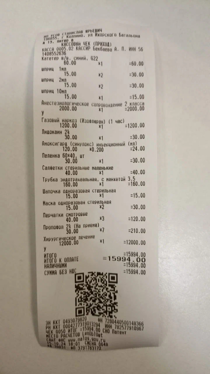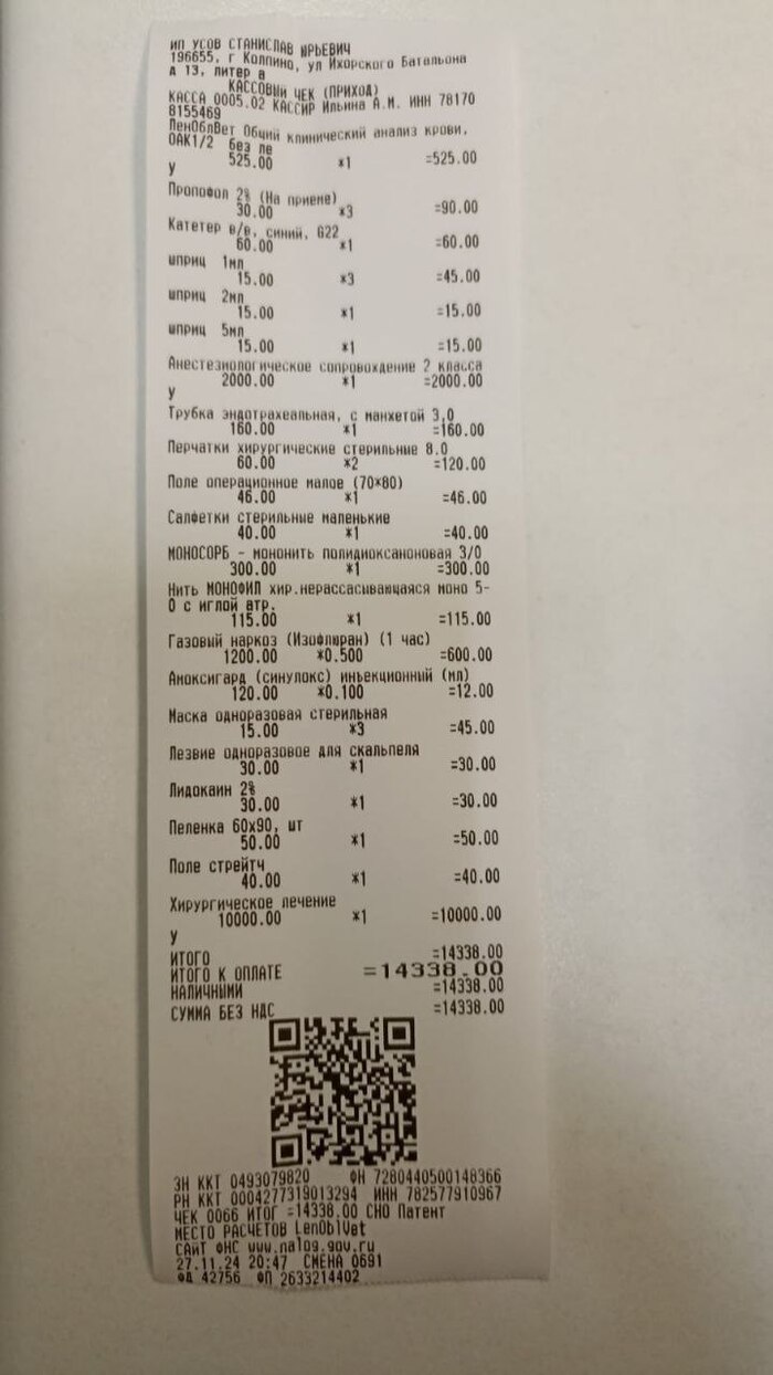 14 338 рублей – операция у Розового Носа (выпадение кишки). Анализы + стац