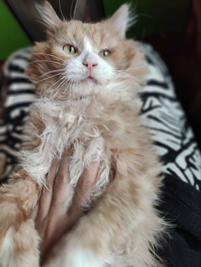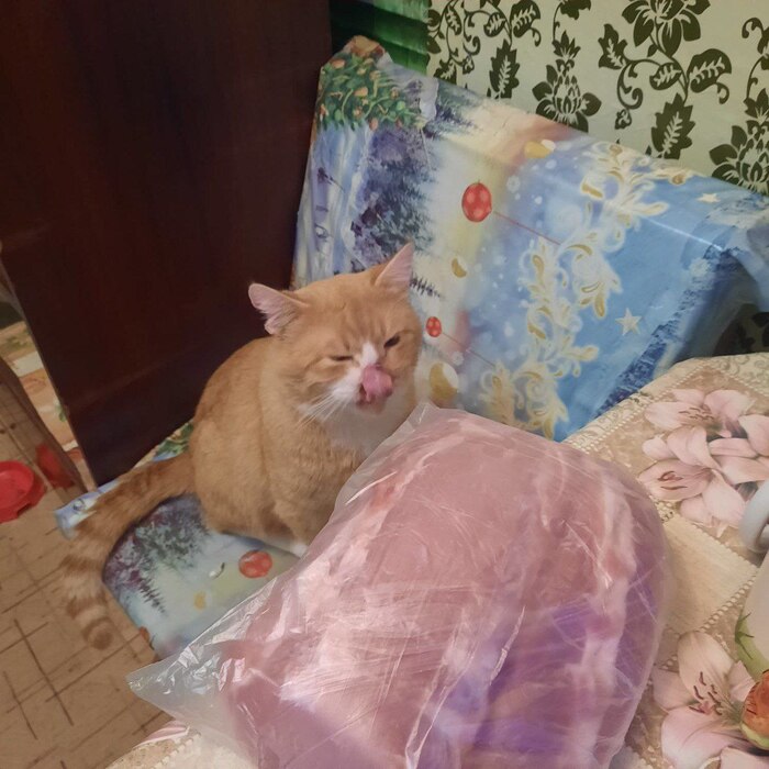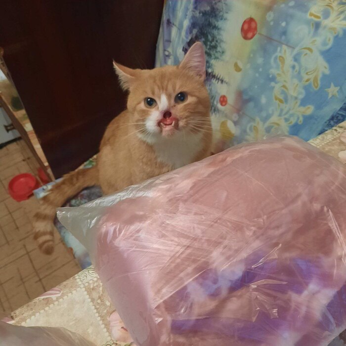 Всем привет от Рыжего. Недавно он устроил мне нервотрёпку. Он каким-то образом съел кусок шкурки от банана (которая лежала на столе). Хотя на данный момент он даже не ест кусочки, только фарш или паштет. Я очень боялась, что придется делать операцию и вынимать шкурку, так как на день Рыжему стало плохо - он скукожился и отказался от еды. Я написала врачу, она сказала, что делать, и пронесло (в прямом и переносном смысле). Обошлось без операции. Теперь Рыжий перешёл исключительно на натуралку (фарш). Другое есть он отказывается.
