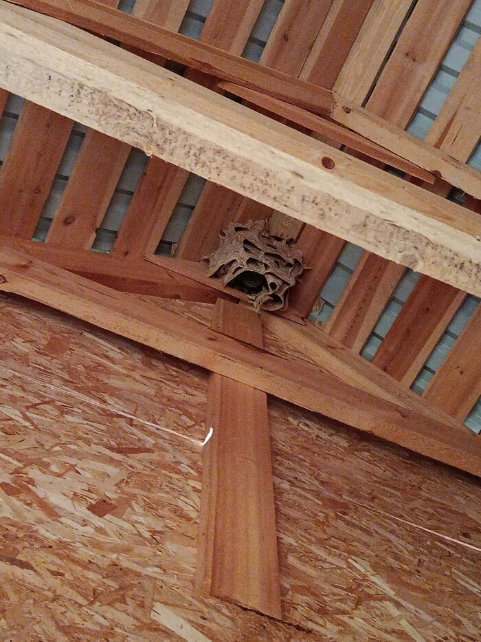 В конце июля заприметил множество шершней, залетающих на чердак моего нового сарая. Но, то времени нет, то в отпуск ехать надо и т.д., так руки до них и не дошли. Приехал перебирать свежий урожай картофана, да и готовить фазенду к зиме - решил посмотреть, как там эти гады. Посмотрел. Купил дихлофоса.