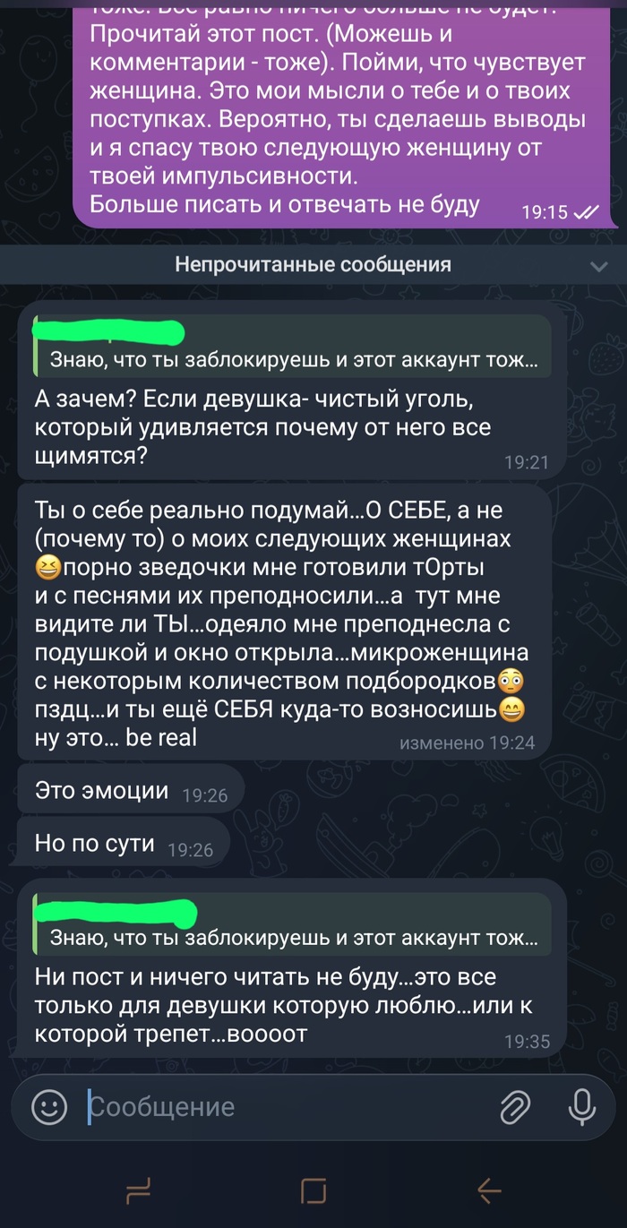 Он пишет фразу "даже не верится, что я встретил симпатичную, здоровую, в меру злословную, живую и раскрепощенную девушку". На что я отвечаю "не обольщайся, со мной явно что-то не так: сначала ты подумаешь, что я ебанутая, а потом убедишься в этом окончательно". На вопрос, в чем это заключается, отвечаю несколькими голосовыми о том, что "я знаю, что охуенна, дефицита мужского внимания не имею, ровно как и недостатка сексуального удовольствия, но вот отношений почему-то нет". И к этому ответила на предыдущий его вопрос о том, чего хочу, "в идеале хочу отношений в формате гостевого брака - встречаемся несколько раз в неделю, иногда кто-то у кого-то ночует, но живем раздельно". И вот тут началась какая-то невероятная волна негатива, унижений, его собственной оценки сказанных слов. Всё, чем я пыталась объяснить и уточнить сказанное, он переворачивает и окрашивает совершенно иначе, нежели я имела в виду. Отказывается меня слушать. И в какой-то момент просто удаляет всю переписку. (Мы общались уже в тг)