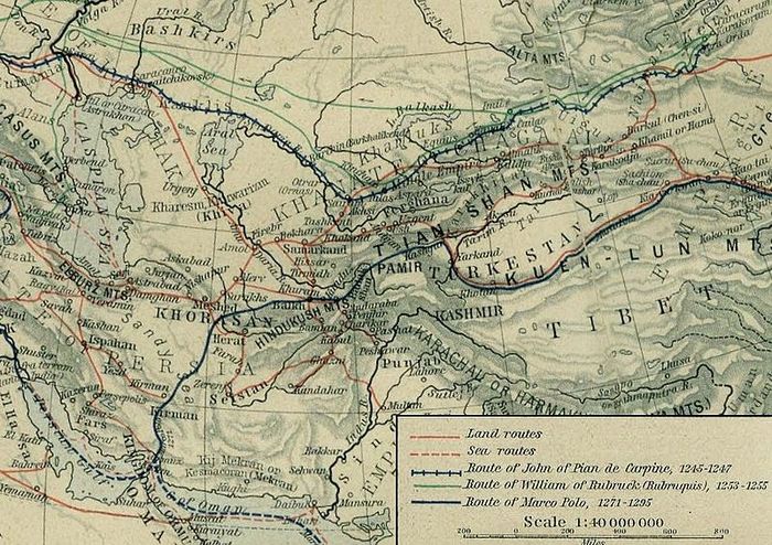 Карта маршрутов путешествий Карпини, Рубрука и Марко Поло