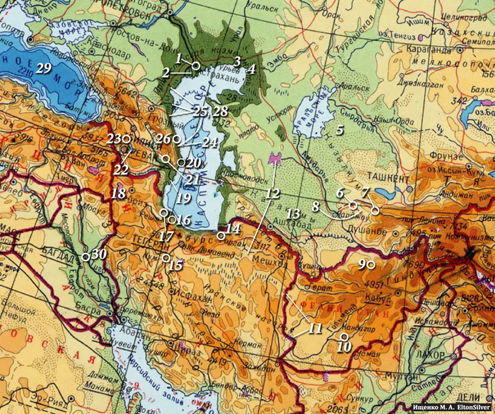 Цифрами на картах обозначены: 1 - Астрахань, 2 – дельта р. Волга, 3 – устье р. Урал, 4 – устье р. Эмба, 5 – Жанадарья, южное русло Сырдарьи, 6 – Бухара, 7 – Самарканд, 8 – оз. Тудакуль (?), 9 – Балх, 10 – Кандагар, 11 – оз. Намазкар или группа озер Хамун (?), 12 – Сарыкамышское оз. или солончак Кевир (?), 13 – территории пустынь (судя по всему, обозначена пустыня Каракум), 14 – Горган (?), 15 – Тегеран, 16 – Лахиджан, 17 – Решт, 18 – оз. Урмия, 19 – устье р. Кура, 20 – Баку, 21 – Шемахы, 22 – оз. Севан, 23 – Лори (нынешняя Лорийская крепость близ Степанавана), 24 – возможно устье р. Самур, 25 – или устье р. Самур, или устье р. Сулак, или устье р. Терек, 26 – Дербент, 27 – неизвестное озеро неизвестного происхождения (?), 28 - или устье р. Терек или устье р. Кума, 29 – Чёрное море, 30 – Багдад.