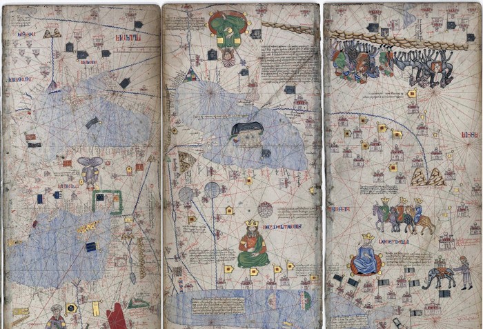 И вновь к картам. Рассмотрим другой атлас. Он менее привычный для нас по структуре, но значительно более ранний, чем «Theatrum Orbis Terrarum». Каталонский атлас 1375 г., состоящий из шести, при этом еще разделенных на две части, листов, из которых четыре последних заняты картой-портуланом.