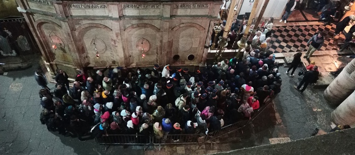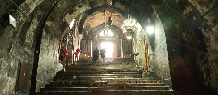 Зашли внутрь, а там вовсю идет служба. Армяне служат под Голгофой, греки - на ней. И проход перегорожен, люди толпятся на входе перед местом распятия, меня несколько раз пытались обойти непонятливые личности, но священник всех заворачивал. Минут через пятнадцать наконец проход к кувуклии был открыт.