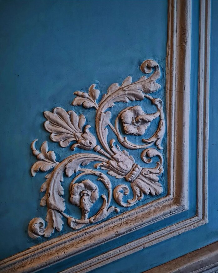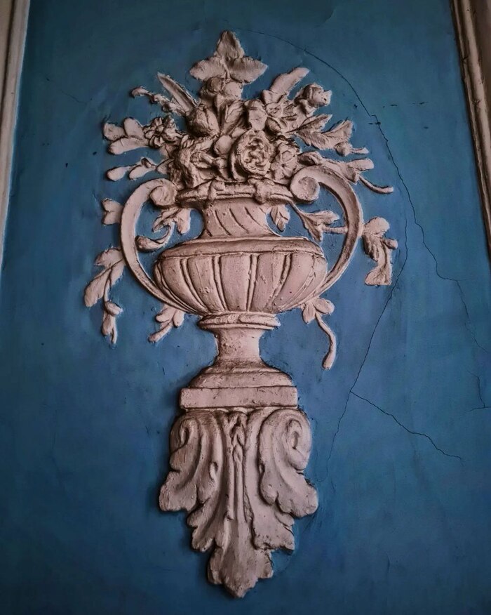 Стены по сей день украшают лепные вазоны с цветами. Потолок обрамляет меандр.