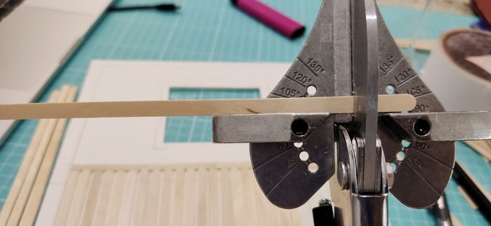 Одинаковые детали отрезала сразу скопом от скрепленного на скотч бальсового веника, чтобы не вымерять каждую отдельно.