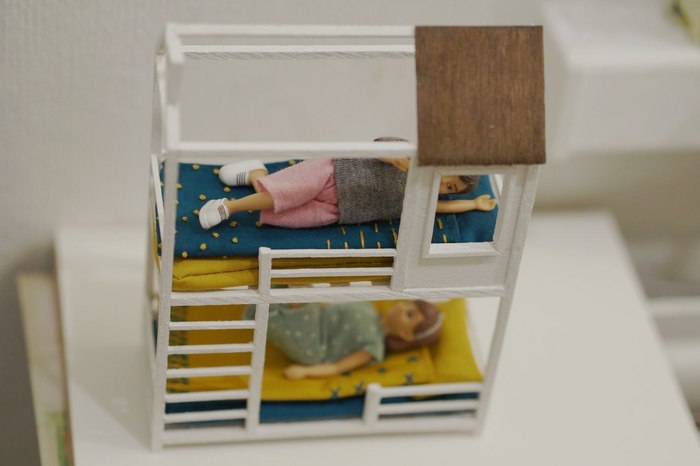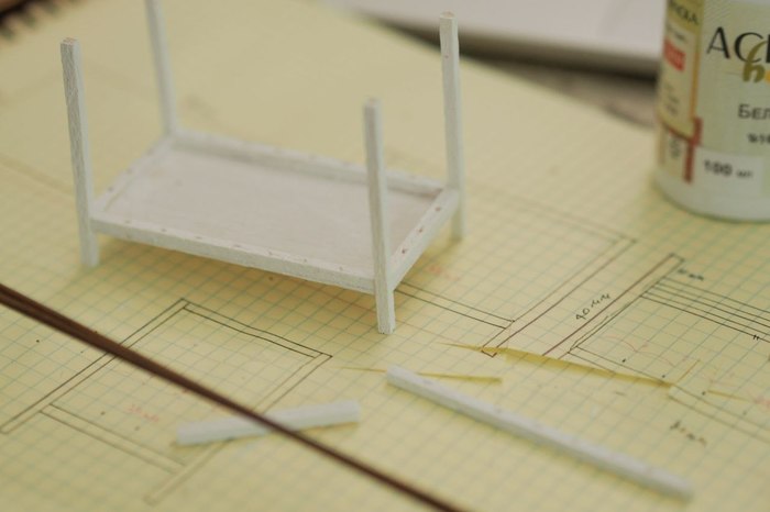 Двухпалубная Двухъярусная кровать. Делала из бальсы, впрок закупленной у китайцев. Бальса — легкое почти невесомое дерево, которое как масло режется макетным ножом. Чертеж сразу делала в масштабе на бумаге в клетку — подсмотрела это у буржуйских моделистов. Так проще и увидеть косяки в проектировании, и отмерять дерево можно, сразу прикладывая к рисунку.
