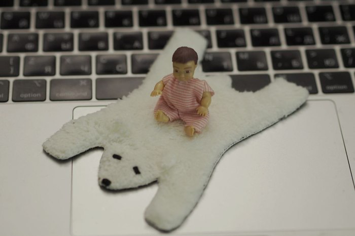 Коврик. Дальше была дань уважения оригинальному наполнению дома Ландби — там тоже был коврик а-ля белый медведь. А я как раз купила набор тряпок для пыли за 200 ₽, они сразу показались мне идеальным вариантом для ковров, покрывал и прочего мохнатого. Из технической ткани, которой отделывают те части мягкой мебели, которые никто не видит, вырезала фигуру летящего с обрыва медведя. И клеем для ткани приклеила ее к белой мохнатой тряпке. Почти готово.