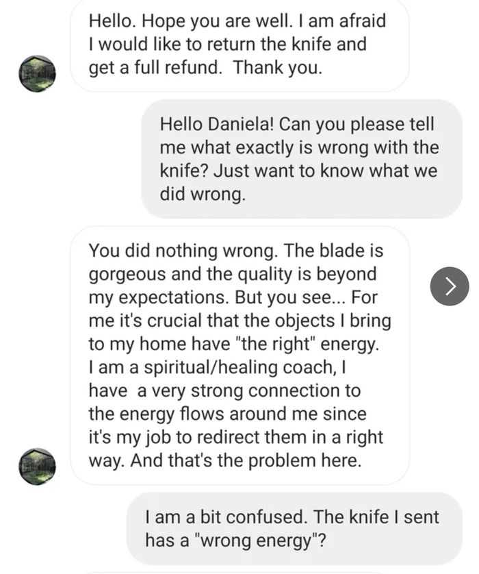 4. — Привет, надеюсь, вы в добром здравии. Боюсь, я бы хотела вернуть нож и получить полное возмещение платы. Спасибо.