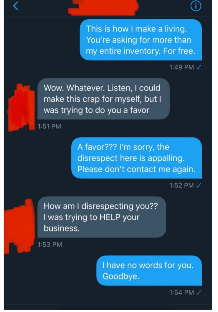 — Абсолютно нет, простите. Я могу понять пару ожерелий, но вы просите отдать бесплатно столько украшений ради рекламного упоминания в вашей Инсте? Я не могу на это пойти.