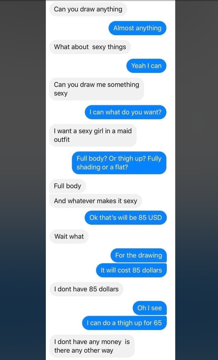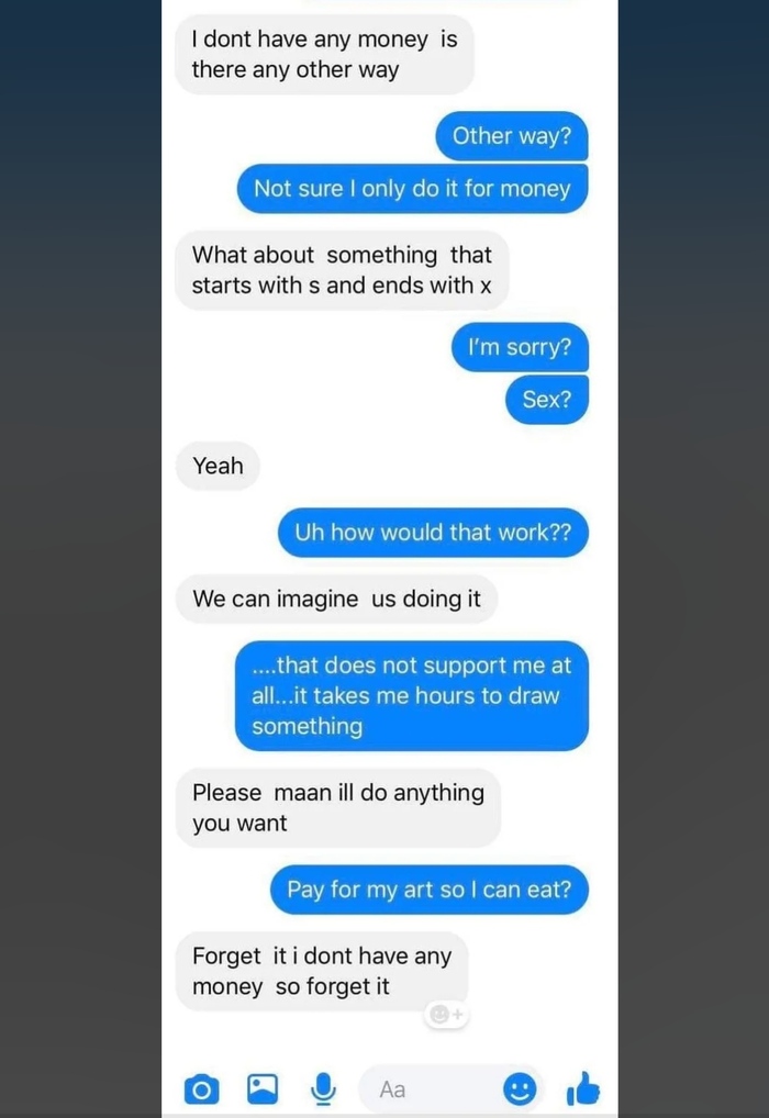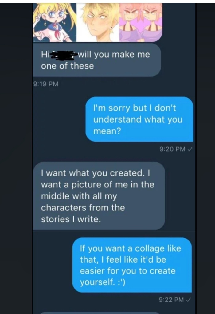 — Простите, я такого не делаю. Я не работаю б/пл, и рисовать на заказ сейчас мне тоже трудно, мой планшет сломан.