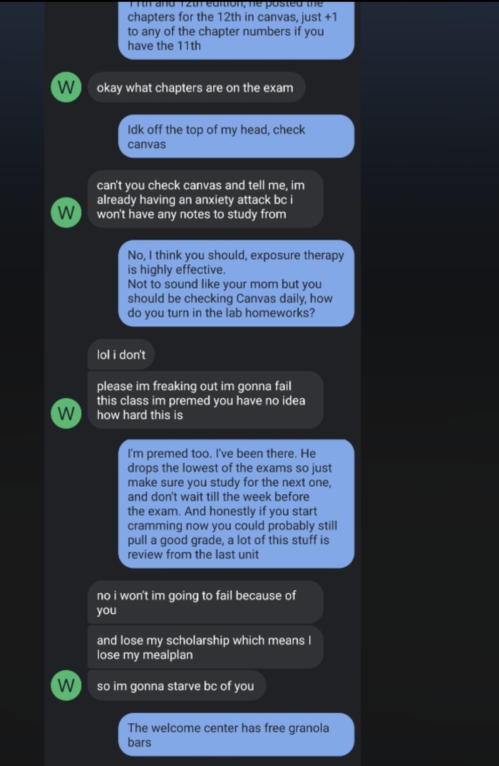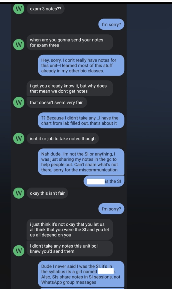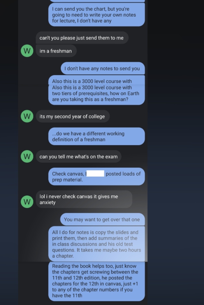 — Неа, подруга, я не куратор группы (в оригинале Supplemental instructor – помощник в изучении сложных предметов, студент, уже прошедший курс и помогающий с ним другим). Я просто делюсь своими записями в групповом чате, чтобы помочь людям. Я не могу делиться тем, чего у меня нет, извиняюсь за недоразумение.