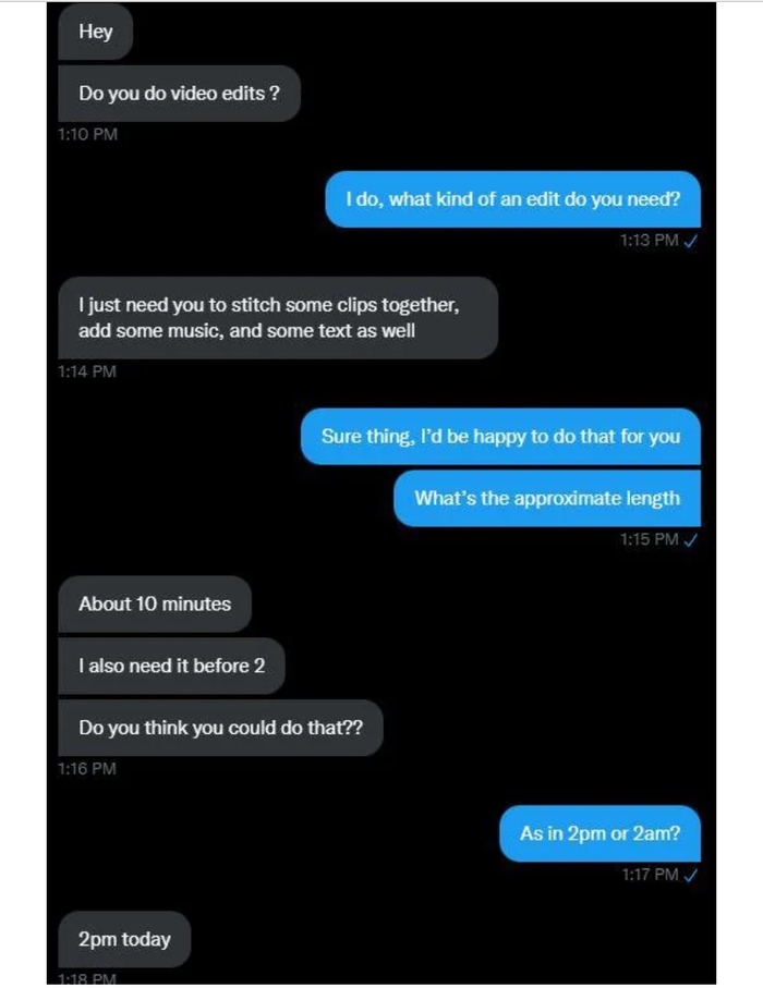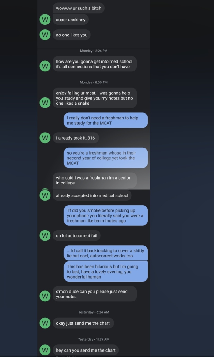 — ЧЗХ, ты накурилась, прежде чем взять в руки телефон, ты буквально 10 минут назад сама сказала, что первогодка.