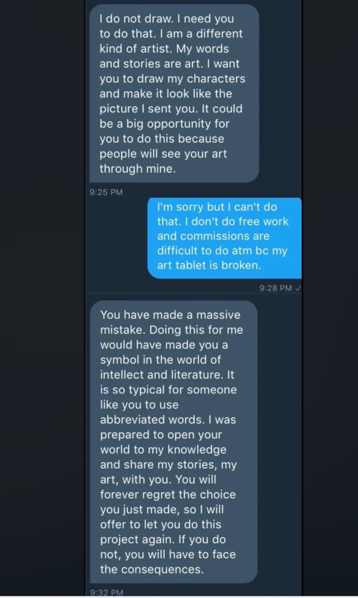 — Я не рисую. Мне нужно, чтобы это сделали вы. Я творец другого рода. Мои инструменты – слова и истории. Я хочу, чтобы вы нарисовали моих героев, и чтобы выглядело похоже на картинку, что я вам послала. Для вас это будет большая возможность, потому что люди увидят ваше искусство через мое.