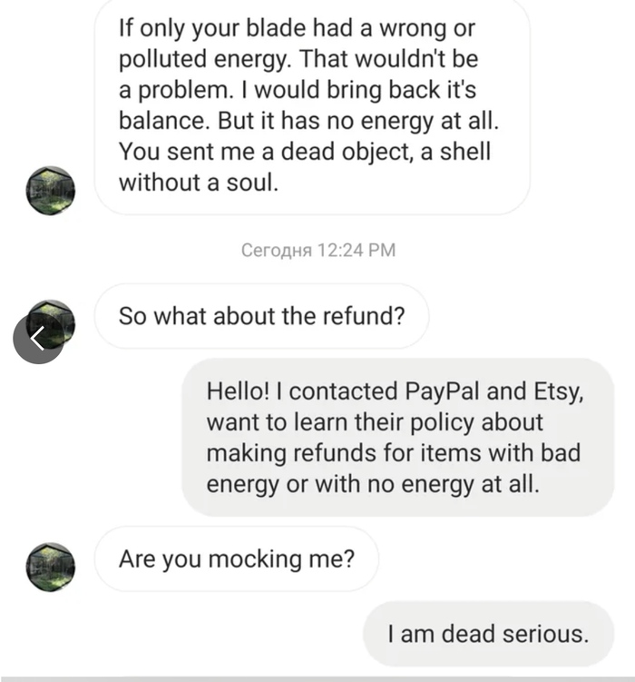 — Привет, я связался с ПэйПал и Этси, хочу узнать их политику насчет возврата предметов с плохой энергией или вообще без нее.