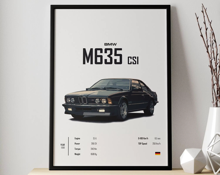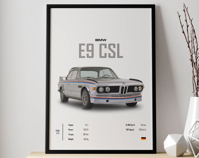 Постер для интерьера с автомобилем BMW E9 CSL. Ссылка на него. Можно красиво оформить свою комнату или СТО.