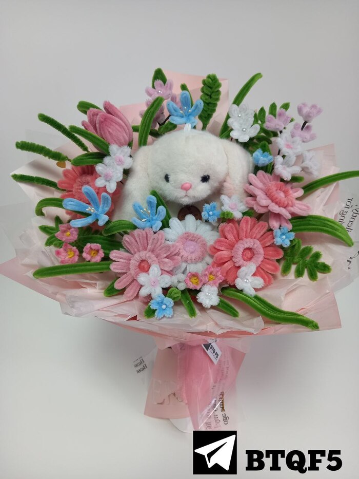Продолжаю осваивать синельную проволоку.... Плюшевые букетики - хорошо, а вот с игрушкой наверное лучше), плюшевые игрушки с плюшевыми цветами , пробую! Одно не давало покоя, как аккуратно закрепить игрушку (не насаживая на шпажку)? Решение нашлось и я рада что зайкин бережно привязан и его можно спокойно достать из букета).