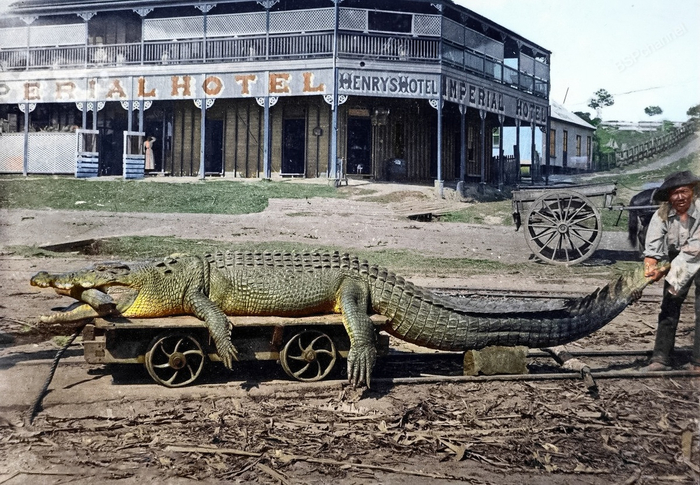 Гребнистый крокодил, пойманный в реке Джонстон, Иннисфейл, Австралия, около 1903 года.
