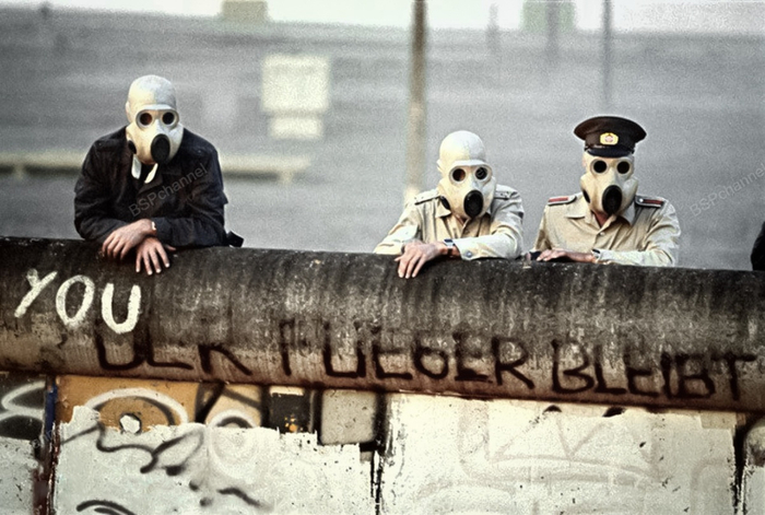 Восточногерманские пограничники наблюдают за разгоном демонстрантов с помощью слезоточивого газа по другую сторону берлинской стены. ГДР-ФРГ, 1988 год.