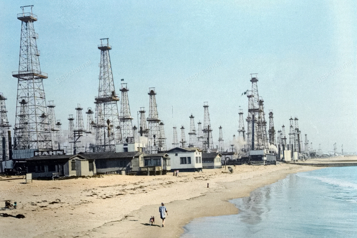 В начале XX века пляж Венис-Бич в Калифорнии выглядел совсем иначе, чем сегодняшний курорт для туристов и скейтеров. Его берега усеивали десятками нефтяных вышек, словно промышленный лес, возвышающийся прямо из песка и прибоя.